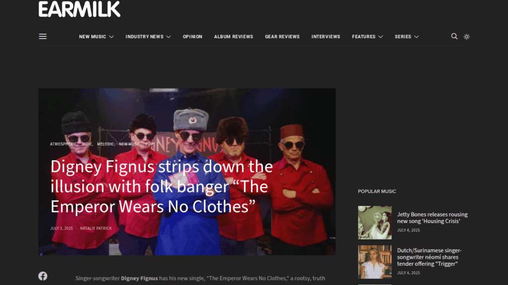 Earmilk Reviews Digney Fignus’ “The Emperor Wears No Clothes” https://earmilk.com/2025/07/03/digney-fignus-strips-down-the-illusion-with-folk-banger-the-emperor-wears-no-clothes/