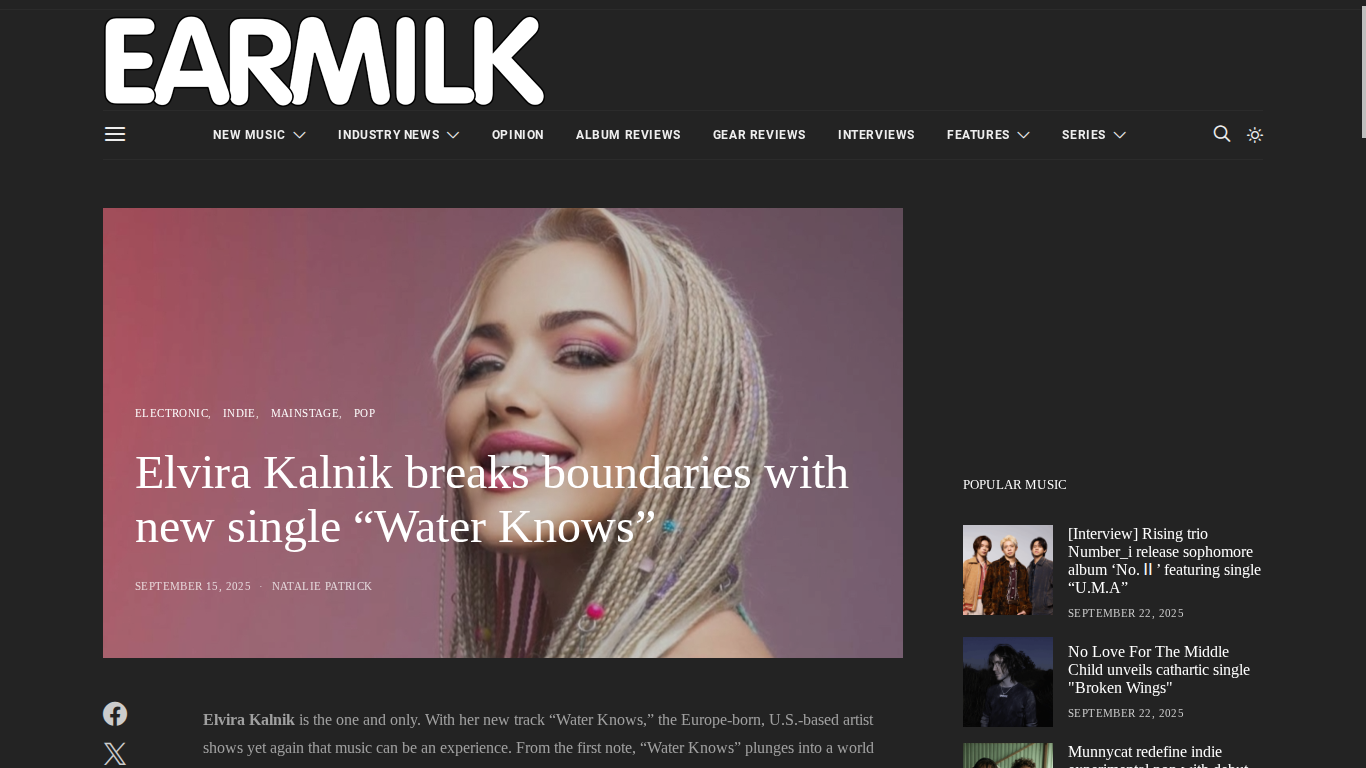 Earmilk Reviews Elvira Kalnik’s “Water Knows” https://earmilk.com/2025/09/15/elvira-kalnik-breaks-boundaries-with-new-single-water-knows/
