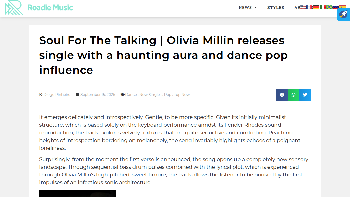 Roadie Music Reviews Olivia Millin’s “Soul for the Taking” https://roadie-music.com/soul-for-the-talking-olivia-millin-lanca-single-de-aura-assombrosa-e-influencia-dance-pop/