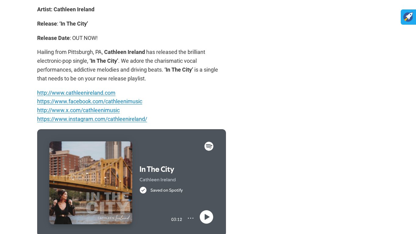 FV Music Blog Reviews Cathleen Ireland’s “In the City” as a “HOT PICK” https://fvmusicblog.com/hot-picks-3-10-25-part-two-the-best-new-releases/