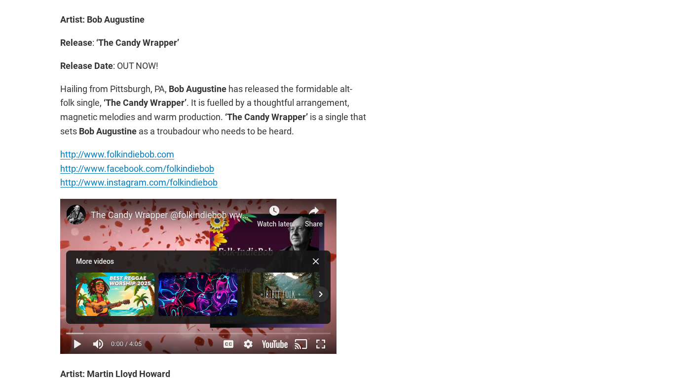 FV Music Blog Selects Bob Augustine’s “The Candy Wrapper” as Hot Pick https://fvmusicblog.com/hot-picks-27-9-25-part-one-the-best-new-releases/