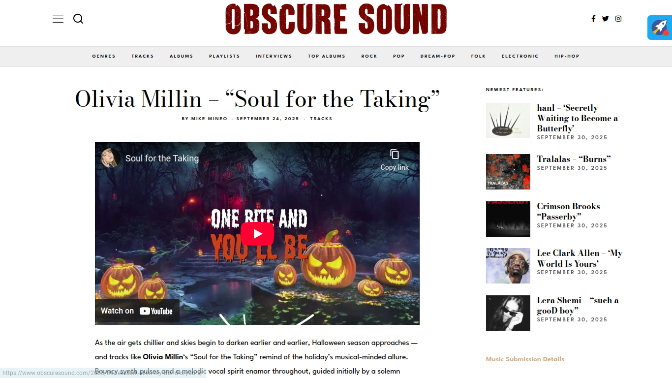 Obscure Sound Reviews Olivia Millin’s “Soul for the Taking” https://www.obscuresound.com/2025/09/olivia-millin-soul-for-the-taking/