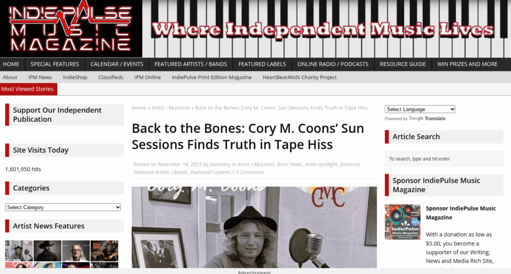 Indie Pulse Music Reviews Cory M. Coons’ “The Sun Sessions” https://indiepulsemusic.com/2025/11/14/back-to-the-bones-cory-m-coons-sun-sessions-finds-truth-in-tape-hiss/