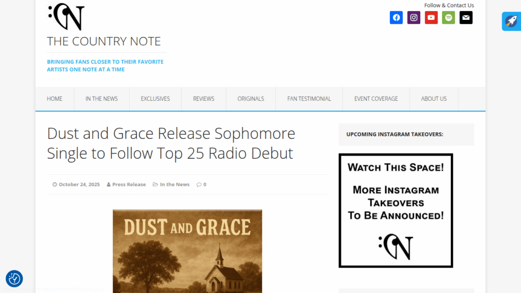 The Country Note Features Dust and Grace’s “He Made It All” https://thecountrynote.com/in-the-news/dust-and-grace-release-sophomore-single-to-follow-top-25-radio-debut/