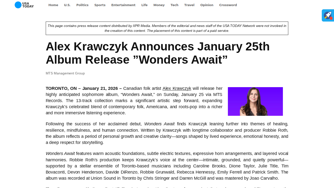 Alex Krawczyk’s “Wonders Await” Featured on USA Today https://www.usatoday.com/press-release/story/23797/alex-krawczyk-announces-january-25th-album-release-wonders-await/?fbclid=IwY2xjawPfDadleHRuA2FlbQIxMABicmlkETFTejRHYWtWSXpnam94WEVoc3J0YwZhcHBfaWQQMjIyMDM5MTc4ODIwMDg5MgABHqVYuQwK5Owpt5p19QmNdNzkUupIYlGSj_N2rlopRuHrgQBpoq8WkwTV48Ix_aem_qmfkiCeP73IjV-xS3Qnf1w