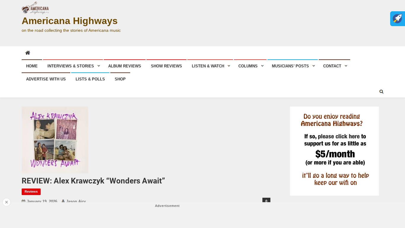 Americana Highways Reviews Alex Krawczyk’s “Wonders Await” https://americanahighways.org/2026/01/19/review-alex-krawczyk-wonders-await/