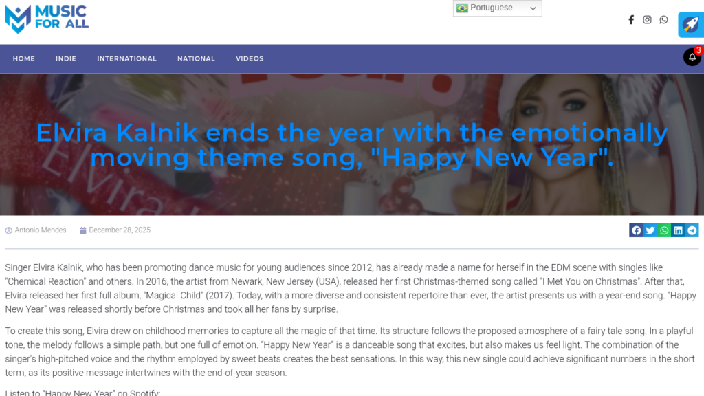 Music For All Reviews Elvira Kalnik’s “Happy New Year” https://musicforall.com.br/elvira-kalnik-termina-o-ano-com-a-cancao-tematica-de-emocionar-happy-new-year/