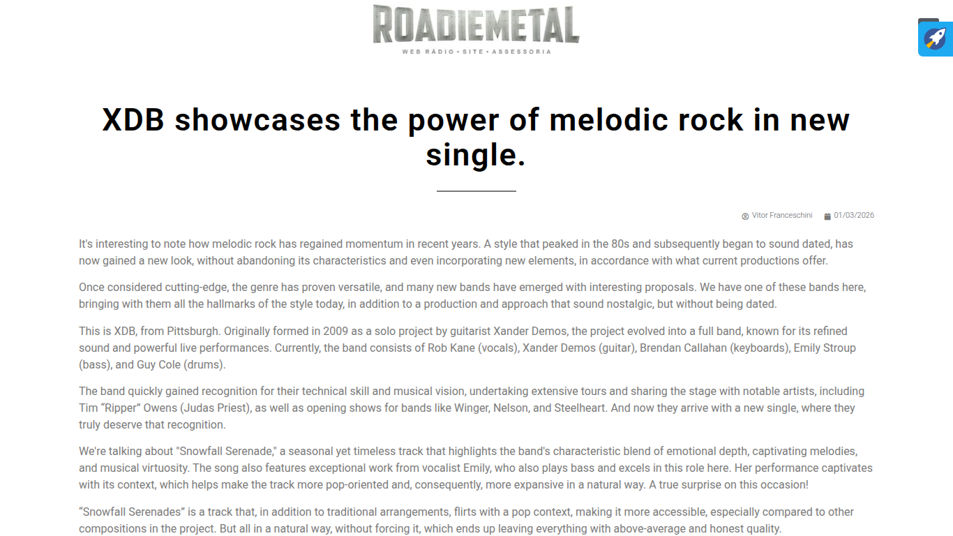 Roadie Metal Reviews XDB’s “Snowfall Serenade” https://roadie-metal.com/xdb-mostra-a-forca-do-rock-melodico-em-novo-single/