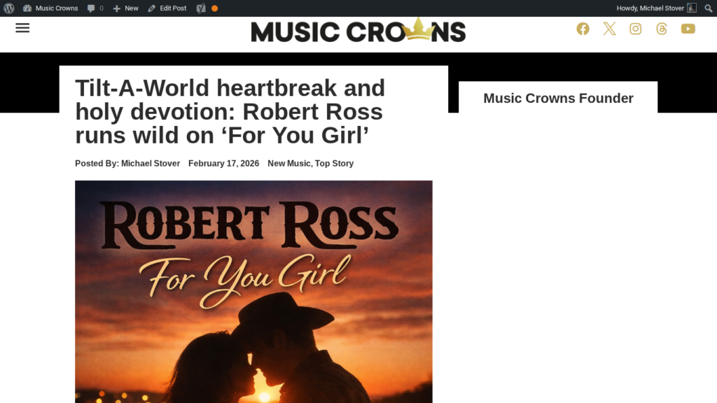 Music Crowns Reviews Robert Ross’ “For You Girl” https://musiccrowns.org/new-music/tilt-a-world-heartbreak-and-holy-devotion-robert-ross-runs-wild-on-for-you-girl/