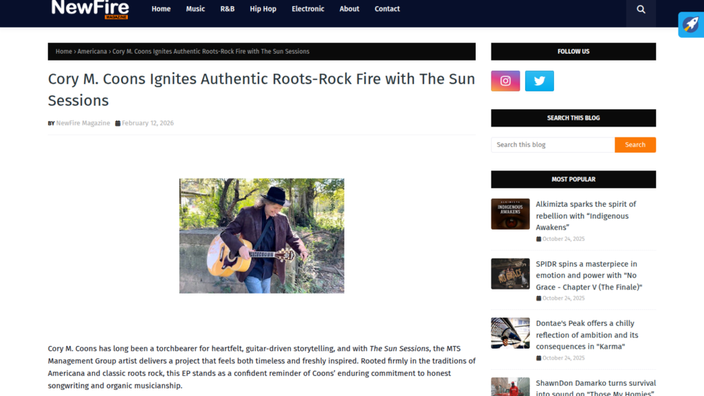 New Fire Magazine Reviews Cory M. Coons’ “The Sun Sessions” https://www.newfiremagazine.com/2026/02/cory-m-coons-ignites-authentic-roots.html