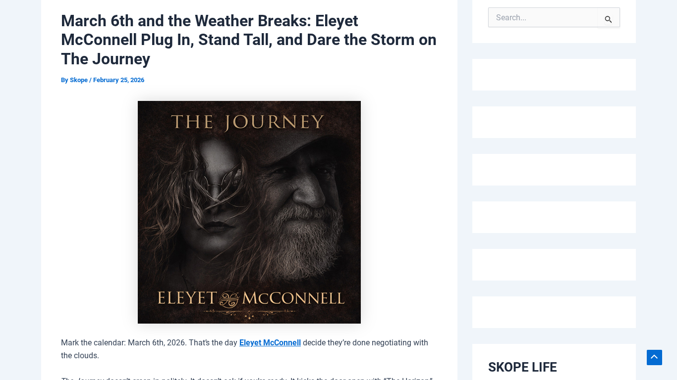 Skope Mag reviews Eleyet McConnell’s “The Journey” https://skopemag.com/2026/02/25/march-6th-and-the-weather-breaks-eleyet-mcconnell-plug-in-stand-tall-and-dare-the-storm-on-the-journey