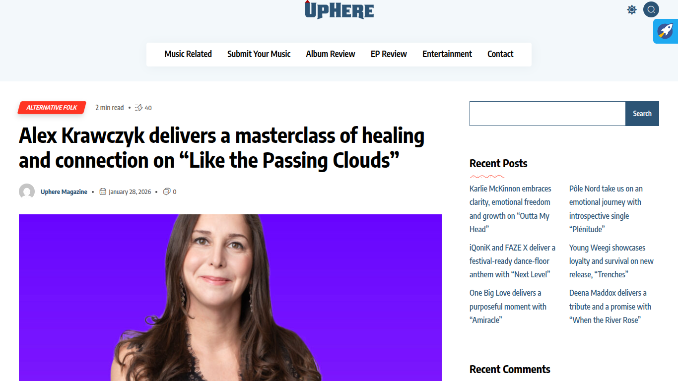 UpHere Magazine Reviews Alex Krawczyk’s “Like the Passing Clouds” https://upheremagazine.com/alex-krawczyk-delivers-a-masterclass-of-healing-and-connection-on-like-the-passing-clouds/