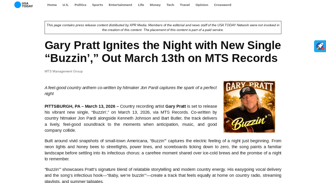 USA Today Features Gary Pratt’s “Buzzin'” https://www.usatoday.com/press-release/story/28320/gary-pratt-ignites-the-night-with-new-single-buzzin-out-march-13th-on-mts-records/